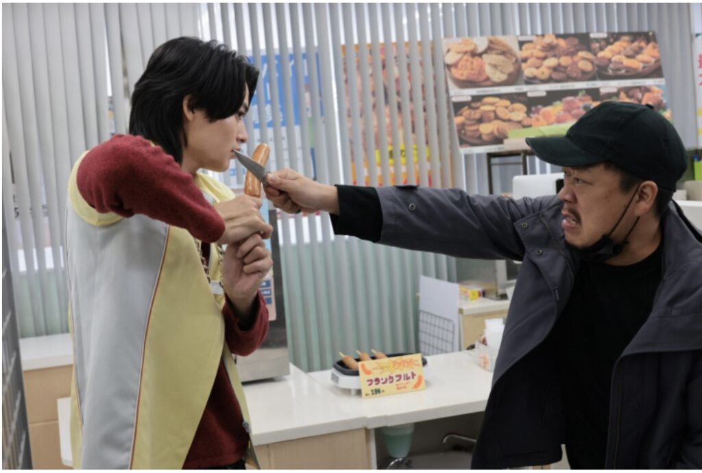 唐突に出てくる強盗、フランクフルトを武器に戦う吠、ナイフをフランクフルトでガード、飛び散る肉汁でダメージを喰らう強盗…