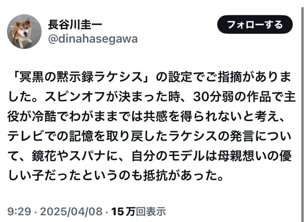 これに気づいた人は結構いたようでXでも意見が飛び交ったのか今作の脚本を務めた長谷川先生がこんなことをポストしていた。