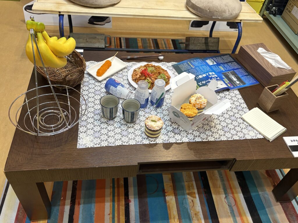 焼きそばに串カツという茶色い男飯の中で燦然と輝くバナナ。2話でソラトが読んでいた雑誌も置かれている。