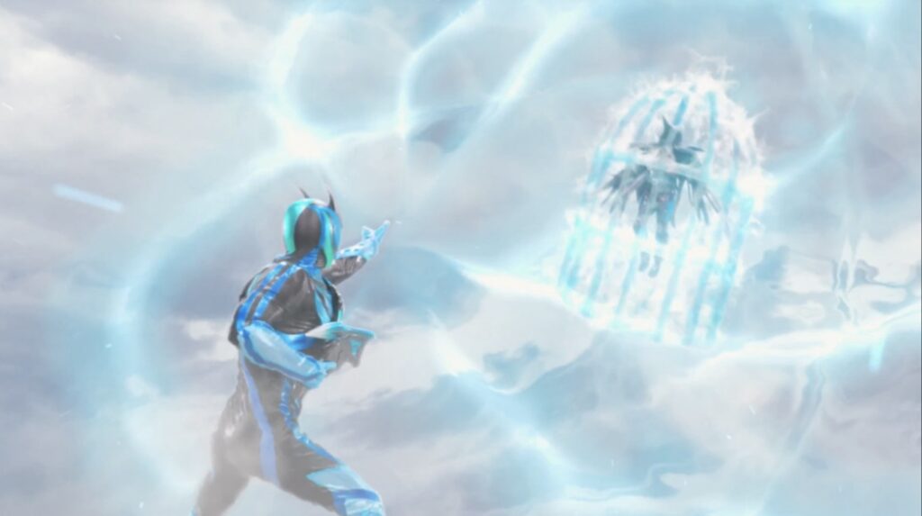 墜落する飛行機を救おうとするヒーローとそれを追う敵との空中戦というアメコミ映画っぽい演出に新フォーム テクノロムストリームによる飛行機をボードにして雲の上をサーフィンするというハッタリの効いたCGが目を引いた空中戦。