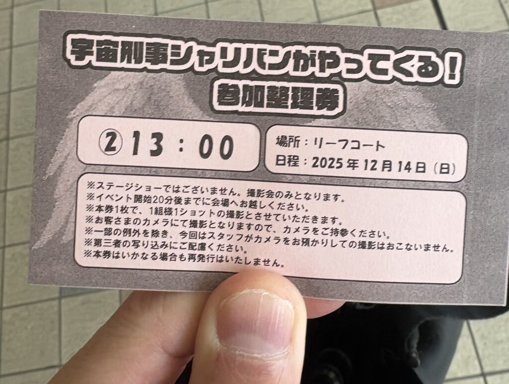 9:30から撮影会参加の為の整理券が配布され10:00の回、13:00の回、15:00の回に分配される。各回50名までというわけでシャリバンと一緒に写真撮れるのは最大150名。
